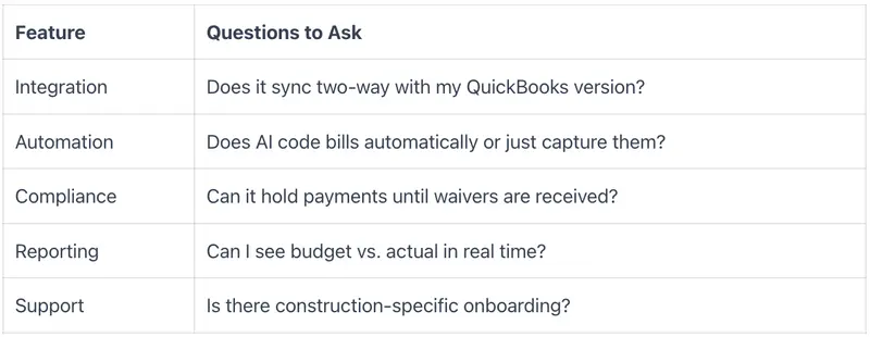 Ask about implementation timeline and support availability. Construction-specific support matters—generic software support often doesn't understand job costing or pay apps.